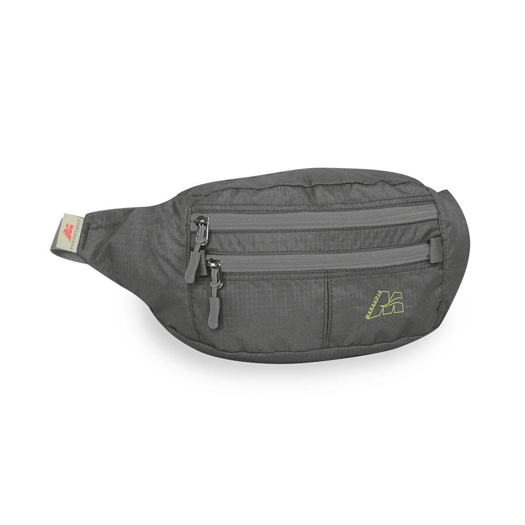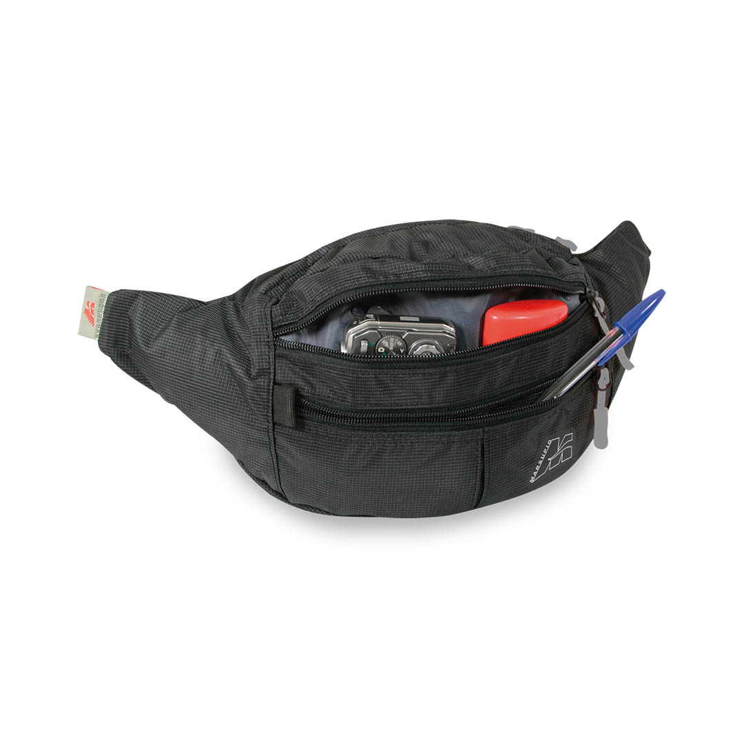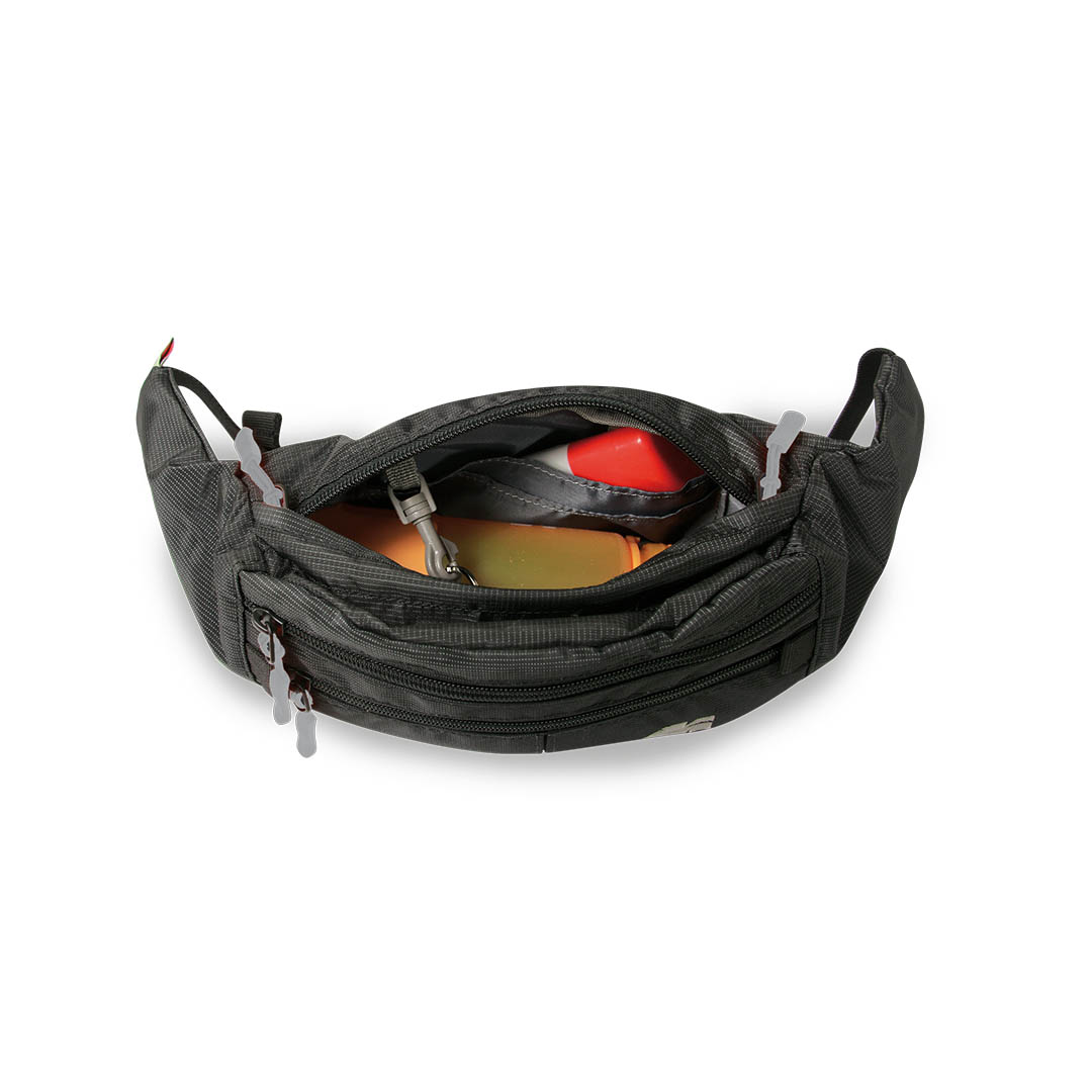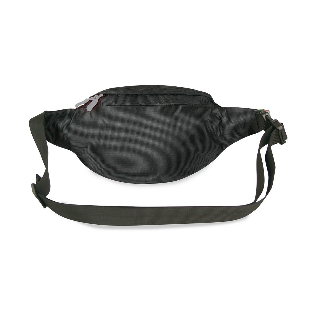 Waist bag with large central compartment, key clip and organizer. 2 front pleated accessory pockets and adjustable shoulder strap.