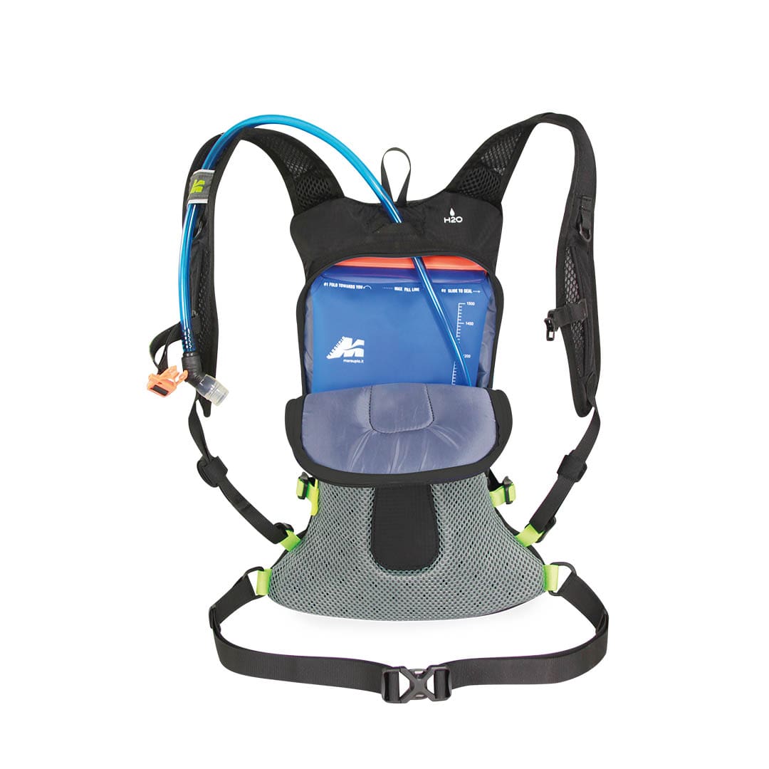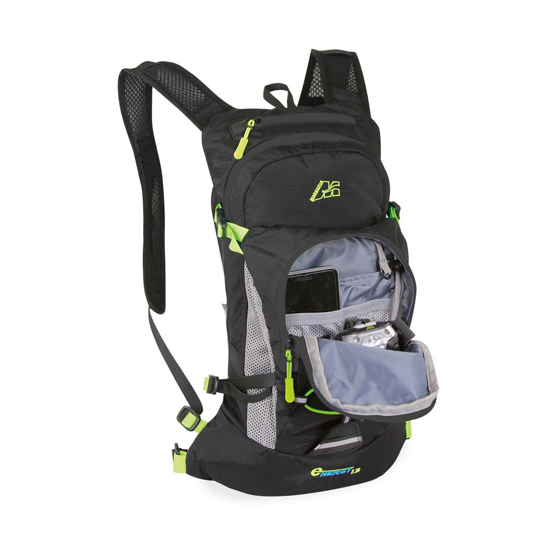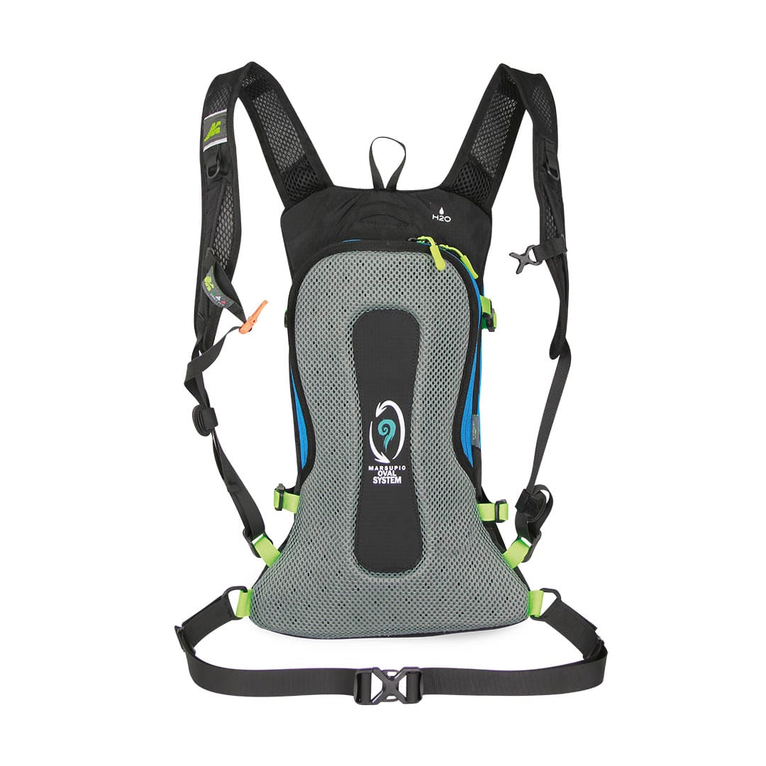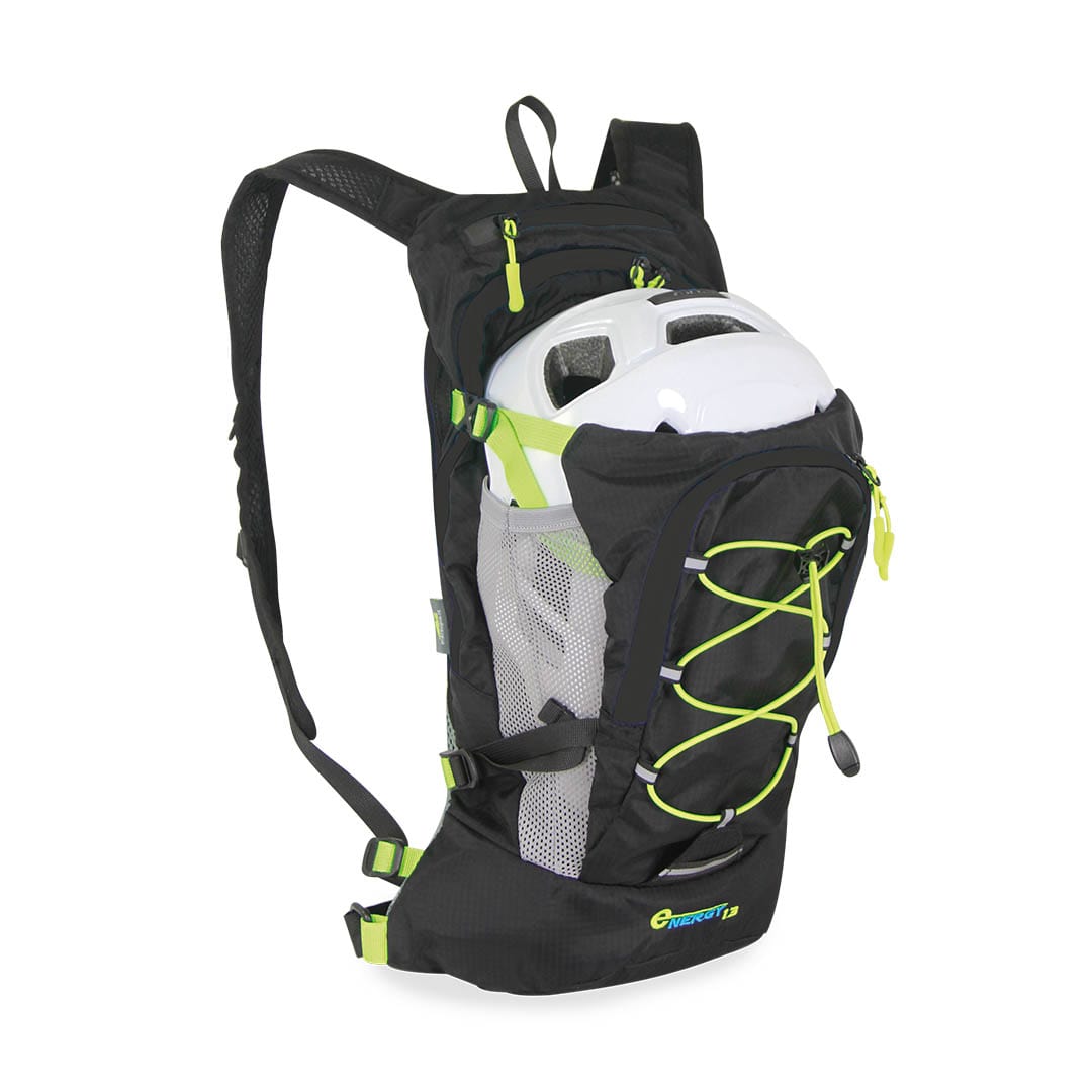 New and light backpack ideal for bikers. It features the OVAL back system with padded mesh cells in the lumbar region. It has padded and adjustable shoulder straps with whistle on the chest strap and simple adjustable waist belt. It provides a number of pockets; in the upper part a small pocket for the keys, 2 in the front one of which is a helmet carrier with compression straps and the other is an organizer pocket. Adjustable elastic also with reflective tape.
