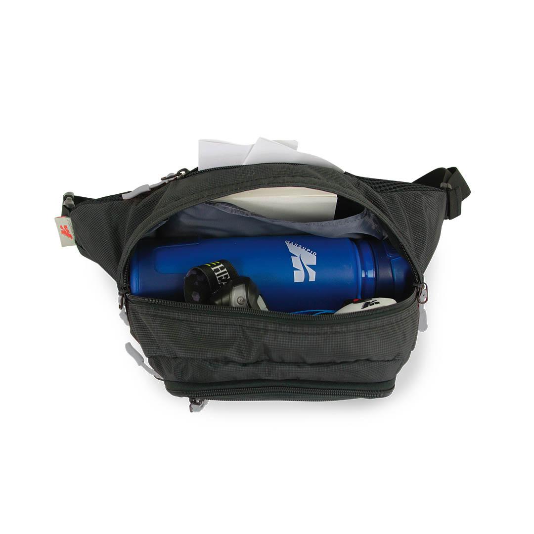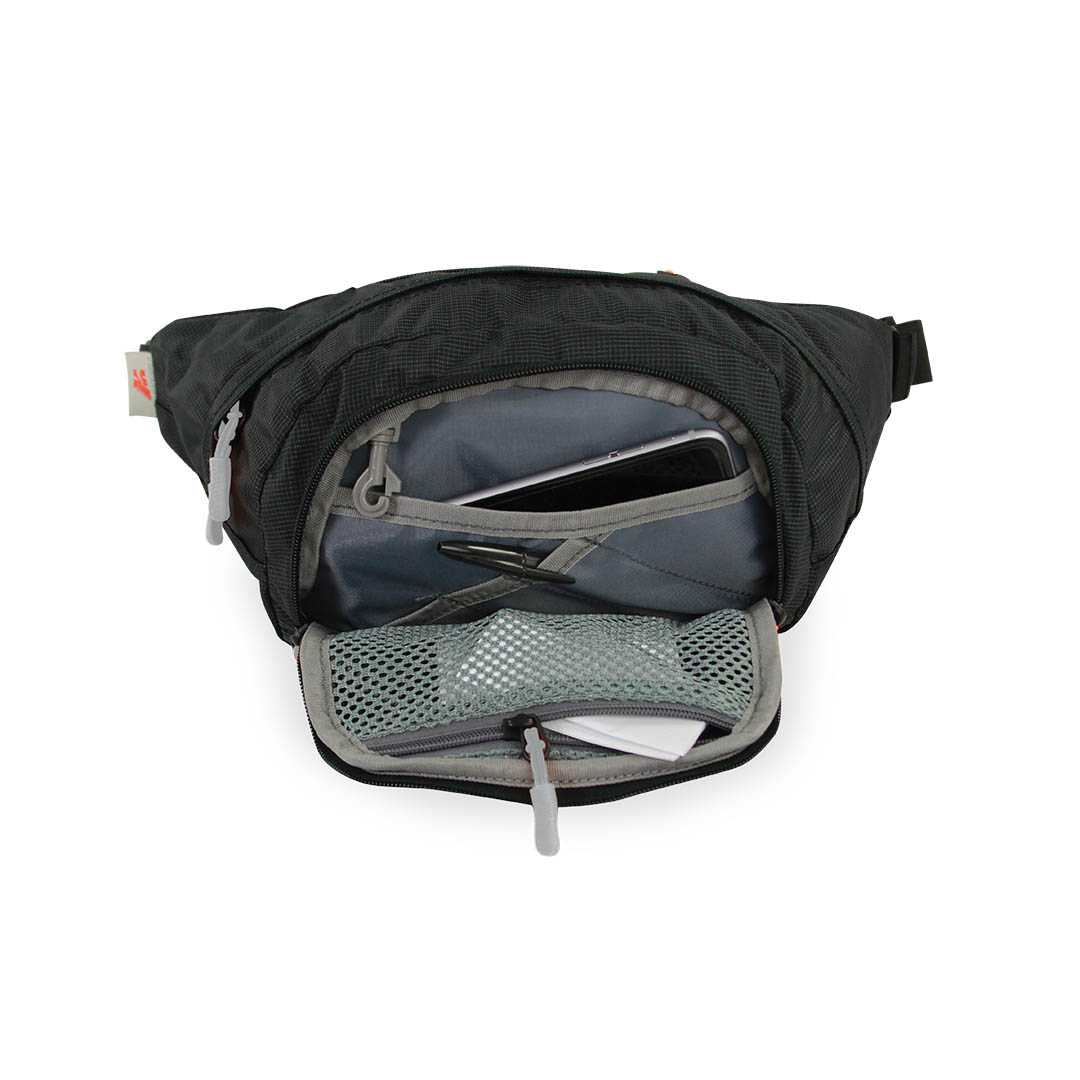 Padded and large waist bag with numerous pockets to provide excellent functionality. The wide opening allows easy access to the main compartment, which features one separated division. The front pocket is equipped with key holder and organizer pockets. Front pocket, and security back pocket.