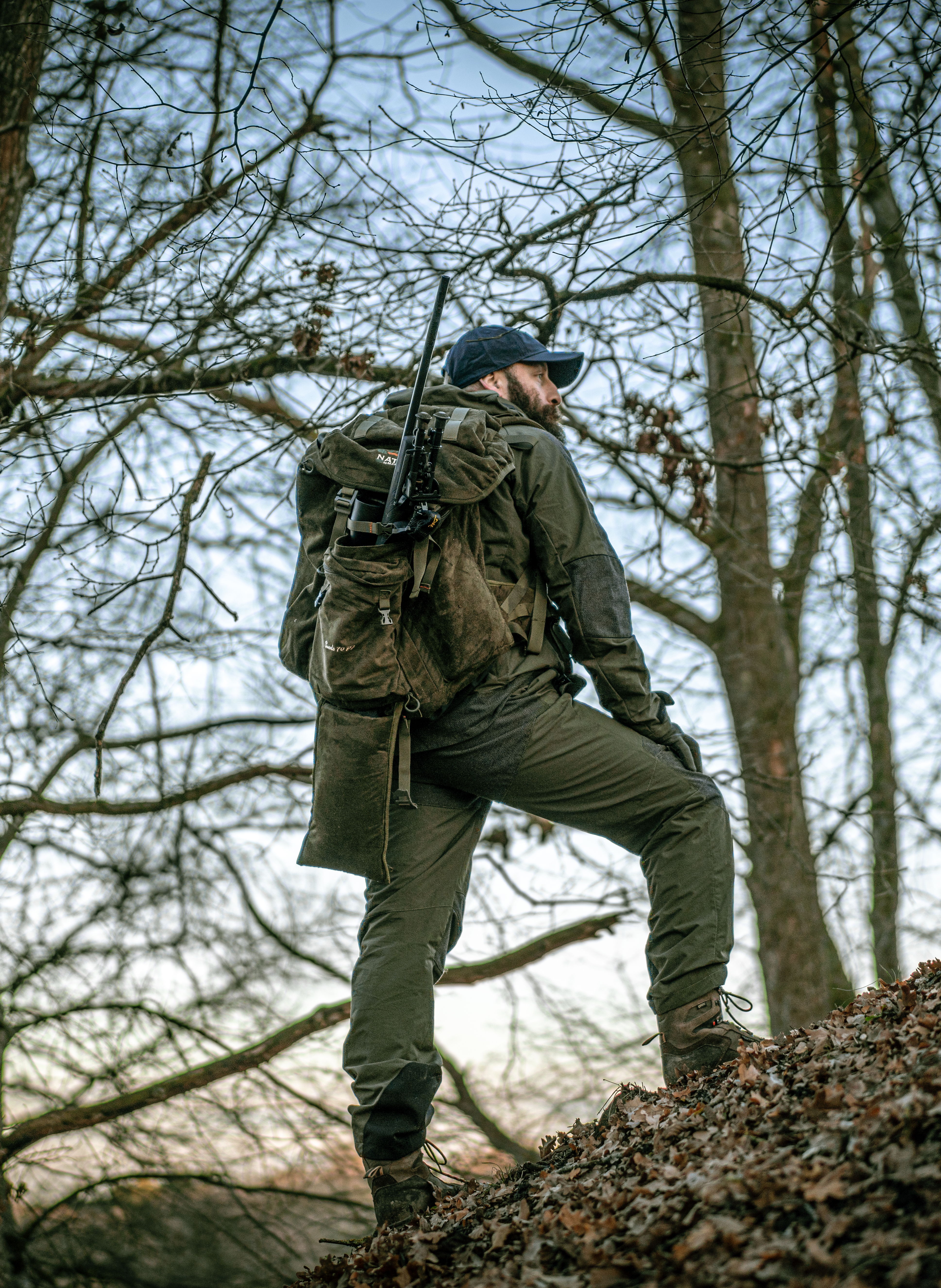 Technical hunting rucksack manufactured from super silent SUEDE material. It employs the FREEDOM AIR MESH SYSTEM, which provides uniform distribution of the load and keeps the back always fresh. It has adjustable and padded shoulder straps and sliding chest strap with emergency whistle. The new HOOKS opening system allows an ultra-fast access without noise. It employs two lateral bellows extendible flaps with zipper and Velcro, to increase the volume of the main body, removable heat-sealed liner which is located in one external pocket. The rucksack has 5 pockets: one large frontal pocket, two on the lid (one of which has an SOS instruction panel), 2 lateral pockets (one of which is a scope holder). The frontal foldaway rifle pocket is useful to travel distances safely and comfortably; the padded sock for protecting the rifle but can be attached to the external buckles and used for hanging clothes. When not in use the pocket becomes a spacious stow compartment. It is also fitted with an internal rifle pocket which can be quickly accessed by means of the new zip in the hood. Thanks to the two hooks on the base it is possible to reduce the size of the rucksack. Waterproof pull-out raincover in the base.