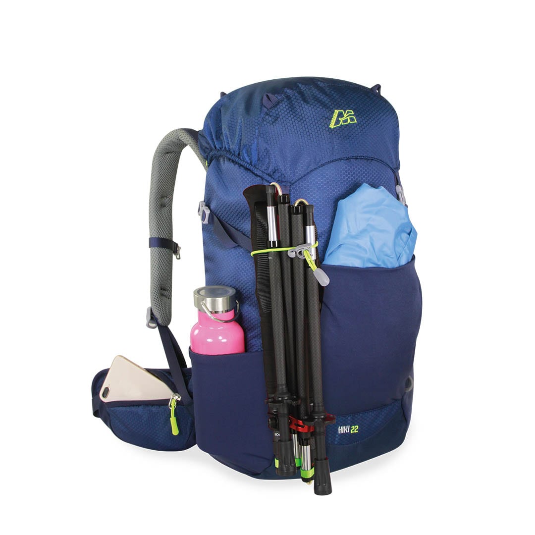 Lo zaino è dotato di asole sul cappuccio e frontali per l’aggancio del Kit 3 (porta caschetto) o del Kit 4 (cinghie porta ciaspole), oltre a cinghie di compressione laterali per stabilizzare il carico e attacchi porta bastoncini.